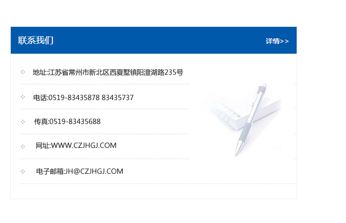 地址:常州市新北區友邦商務大廈1幢16、17層  電話:0519-85101652  傳真:0519-85112595  郵編:213022  網址:www.cz-jiayue_cn.qdtianlang.com  郵箱:xiajifengaa@163.com